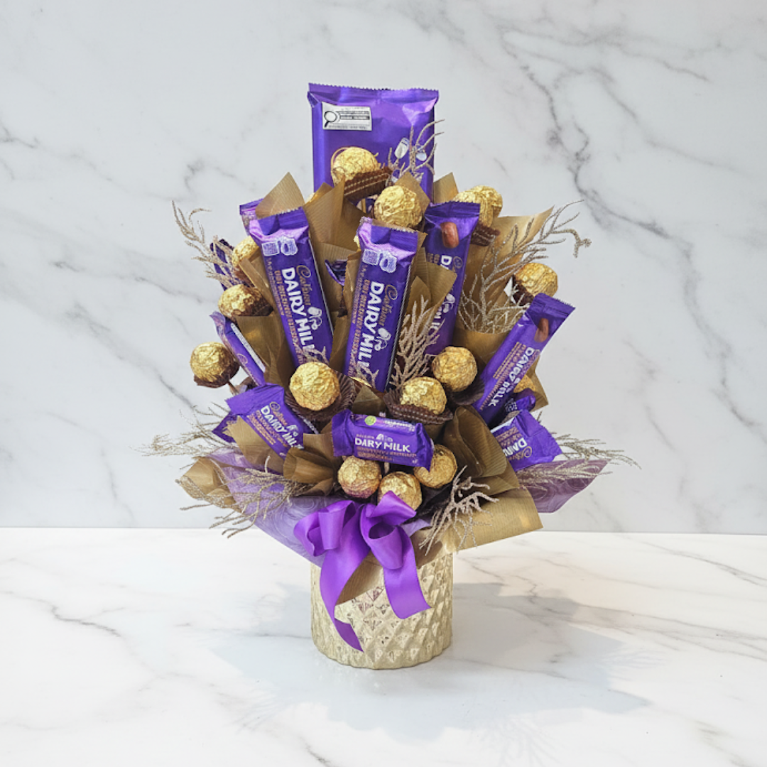Send someone this beautiful and delicious bouquet! Filled with Dairy Milk and Ferrero Rocher chocolates, this is the perfect gift! Who doesn't love chocolate!?
