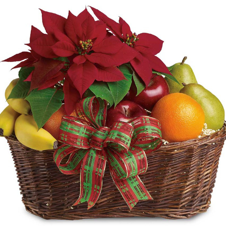 Perfectly festive for friends and associates, apples, grapes, pears and more arrive in a delightful wicker basket. To top it off, a lovely live poinsettia plant and ribbon is included. This fruit basket sends freshest well wishes to all.