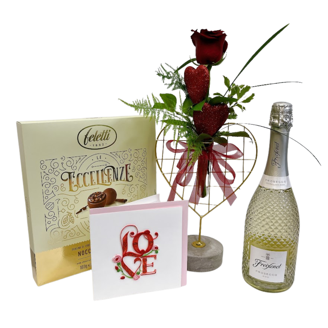 A single fresh red rose in a sweet heart holder, a delectable box of chocolates, a beautiful handwritten Valentine's card and of course the bubbly!
