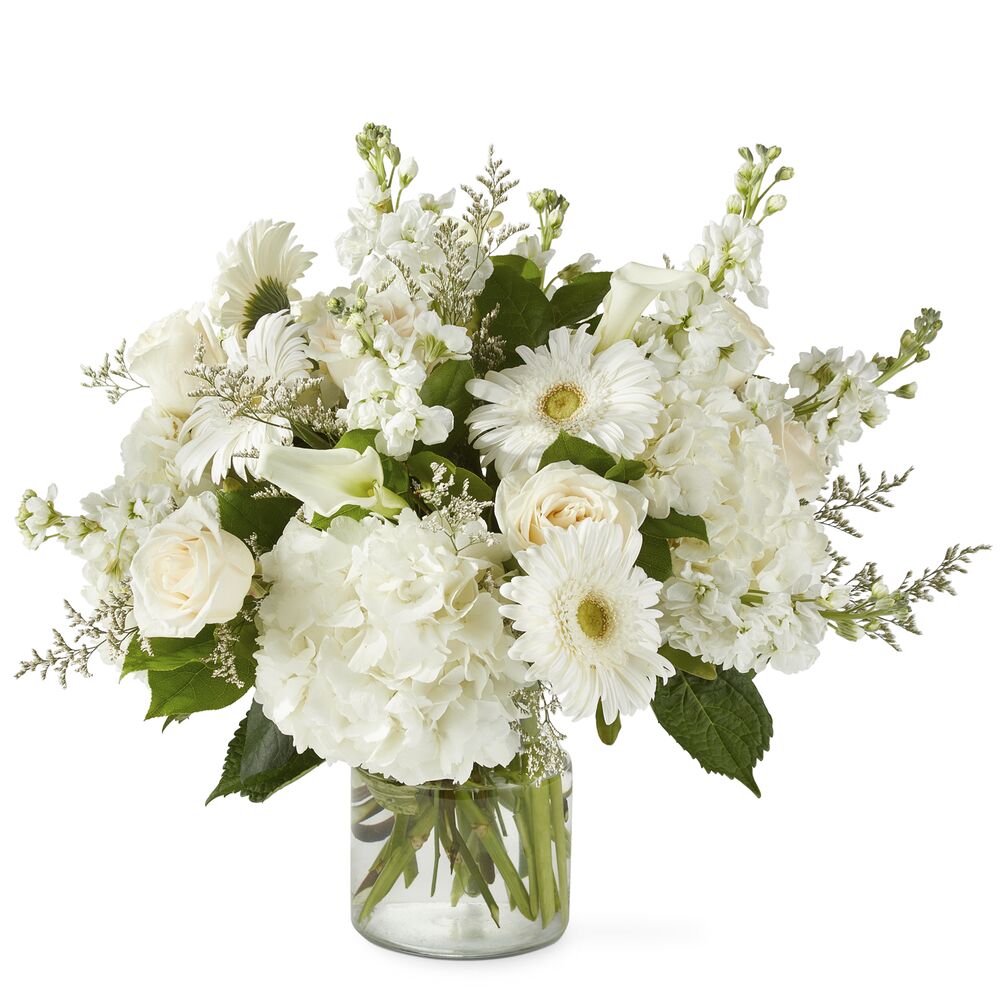 There's nothing plain about this beautiful bouquet. Filled with white roses, hydrangeas, gerbera daisies, mini calla lilies, and Limonium, this classic arrangement is the epitome of taste.